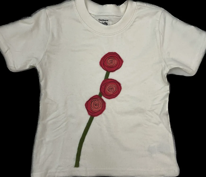 Not your average T-Shirt! This 100% cotton tee is super soft and comfy. This shirt is one of a kind with a hand sewn blooming rose applique adorning the front! Artsy and Unique!