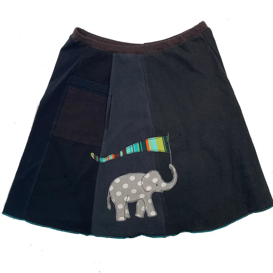Classic Appliqué skirts are made with high quality, up-cycled t-shirts. Freestyle sewn images are appliquéd on panels of various colors making each skirt unique and interesting. Each skirt has a convenient pocket. Since there is no real “front” or “back”of this skirt, simply place the pocket where you like.
