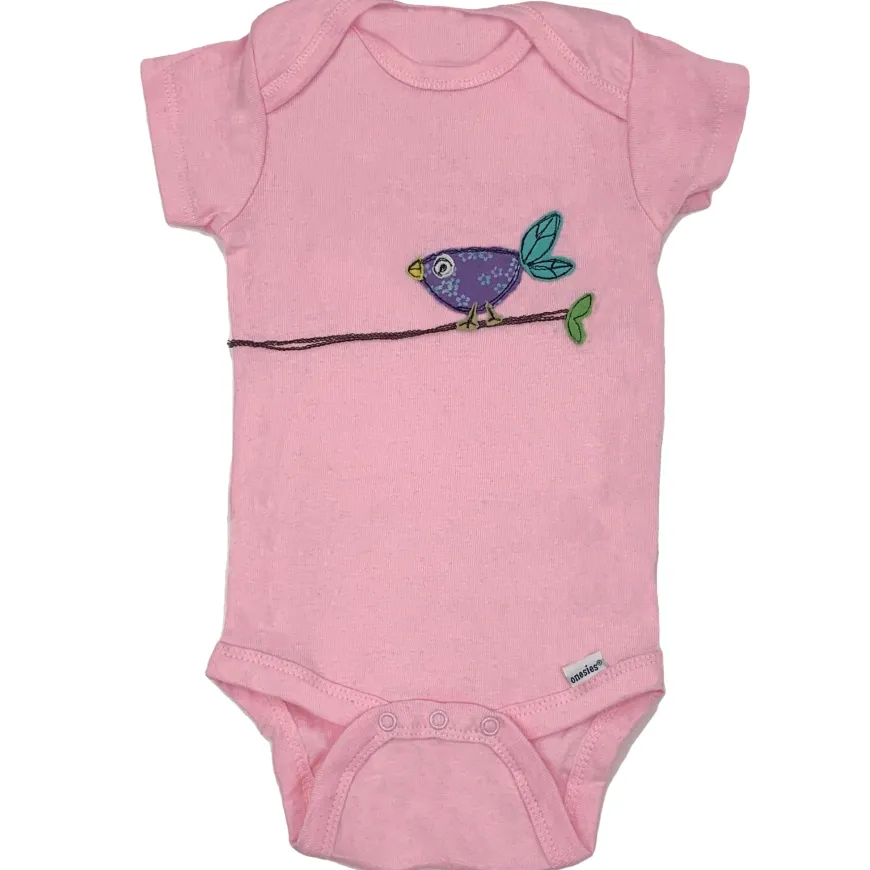 This cute purple pattern bird is artfully applied to a short sleeve pink onesie. Perfect for your little birdie!